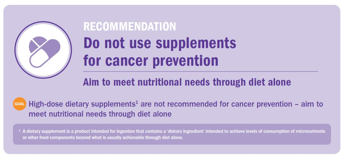 《膳食、营养、运动与癌症:全球观点》报告分别于1997年和2007年发布了第一版和第二版,前不久新鲜出炉的是第三版报告。该报告是基于数百项研究结果,5100万人数据,其中包括350万癌症病例,科学家们对现有科学研究进行了最全面的评估,基于大量可靠的最新循证证据,报告提出了10项癌症预防的建议!全世界医学专家都称赞该报告是一项里程碑式的成就!这十大建议中其中第八条就是“不随意吃各种营养补剂”,换句话说,好好吃饭,好好运动,就是预防癌症的最佳生活方式!