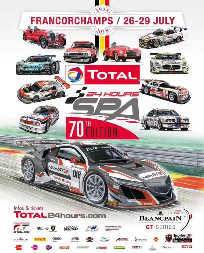 为了给本届赛事预热,赛事方早早就公布了今年的70周年主题海报。在海报的最显眼位置,是一台我们既熟悉又陌生的车,本田 NSX GT3赛车。虽然早在两年前就已经亮相,但大部分时间 NSX 只在北美赛场征战。此战是它在斯帕24小时耐力赛的首秀,自然要把海报的C位让出来给他啦!