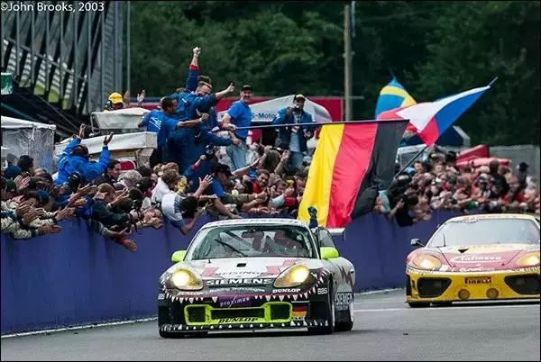 2003年的斯帕冠军,并非来自最高组别。由于斯帕天气复杂多变,比赛期间阴雨连绵,各种机械故障和意外事故频频发生,只有不到一半的赛车完成比赛。最终的冠军属于N-GT组别 Freisinger Motorsport 车队的50号 Porsche 911 GT3 RS 赛车。无懈可击的表现成就了又一场低组别打败高组别的经典战役。