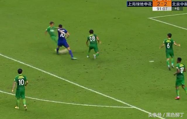 申花前场攻势,国安禁区内一片混乱,此时莫雷诺在禁区线上拿到射门机会。身边的韦世豪看准机会准备一脚解围,然而神奇的事情发生了,莫雷诺倒是没有射门成功,反而被韦世豪抢先出了一脚,但是韦世豪这叫解围却奇葩了,直接变成了射门,飞入球网!