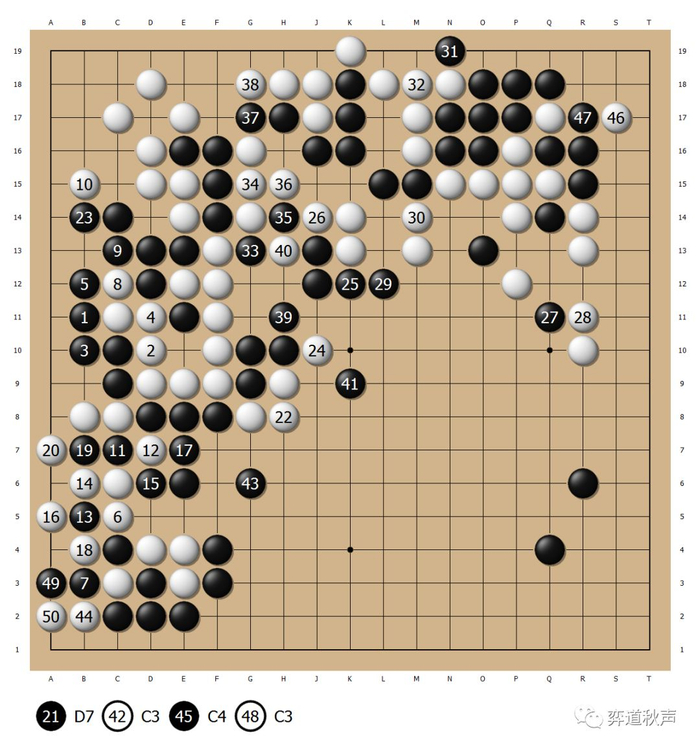 黑35长出,然后黑39碰白棋星位角,井山采用声东击西的战术。