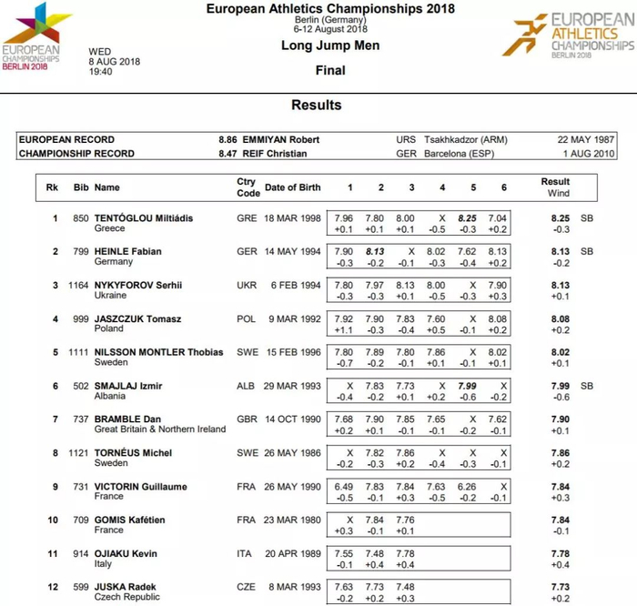 男子跳远决赛,希腊新锐滕特格娄以8.25米夺冠。