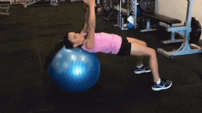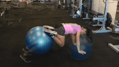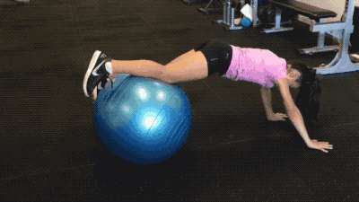 第四组练习,小选手双腿搭于瑜伽球上、小腿紧紧贴球,以俯卧撑状支撑于地面;利用腰腹肌肉左右转动身体,注意保持双腿始终置于瑜伽球上,双臂支撑不要弯曲。