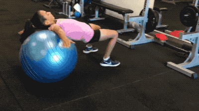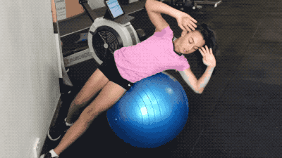 第七组练习,小选手腰下部及臀部贴在瑜伽球上,侧身弯曲腰部进行侧卧起坐,练习过程中要保持瑜伽球及身体的稳定与静止。