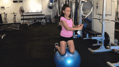 第一组练习,小选手以跪姿跪于瑜伽球上,手持球拍,正反手交替进行挥拍练习,过程中需要依靠腰部及腿部肌肉协调配合保持身体的平衡,不从球上落下。