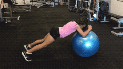 第五组练习,小选手双脚前脚掌着地,身体前倾,双臂弯曲,利用肘部及小臂支撑于瑜伽球上。练习过程中手臂发力,配合全身肌肉在瑜伽球上进行前后往复运动,注意控制球转动幅度,始终保持身体的平衡。