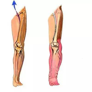 上图中,左侧是正常的腿部,蓝色箭头代表血液正常回流心肺;右侧是腿部抽筋,可以看到抽筋部位肿胀、发炎,形成静脉血栓,导致血液不能回流心肺。