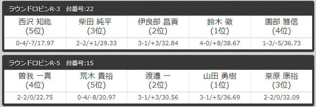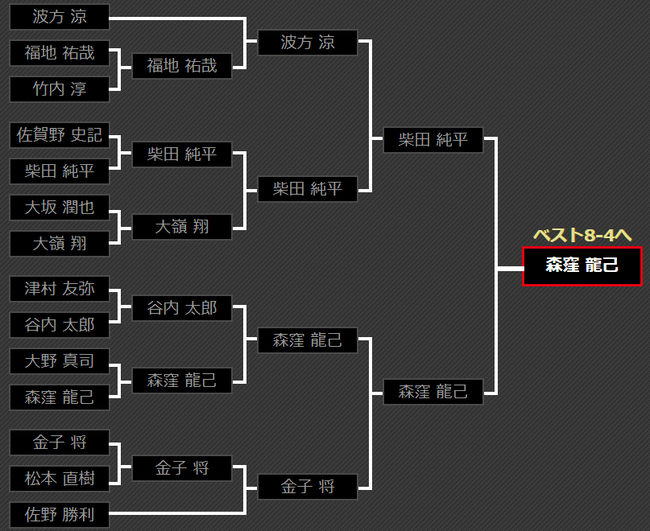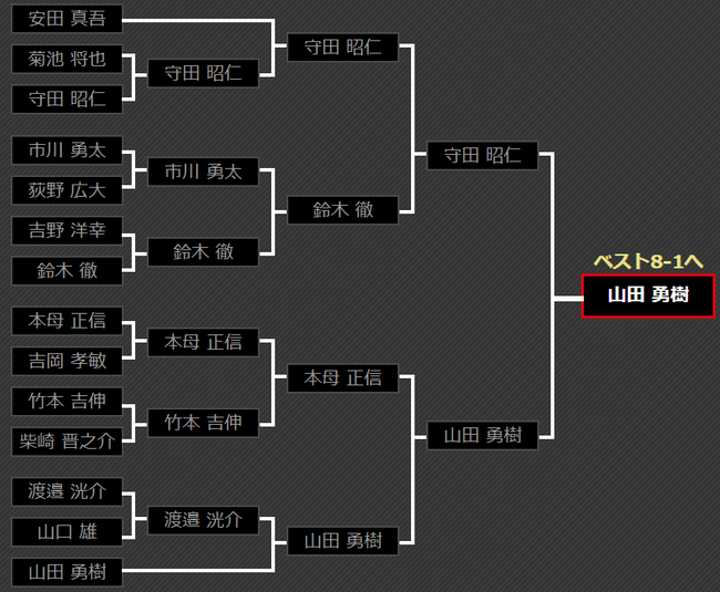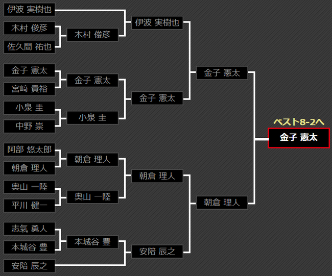 第5区鈴木 康太击败了老将櫛引 譲,又强力击败实力选手上里 徹弥,拿到8强入场券