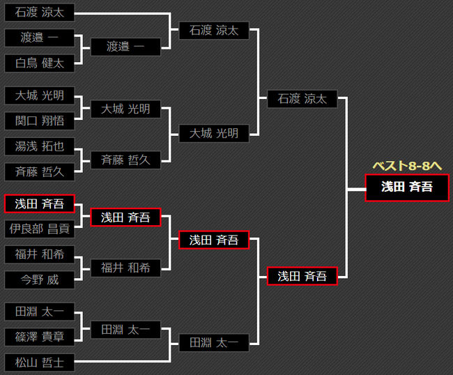 第6区东京本地选手大石 藍貴遭遇近期不断上升的松本 康寿,3:2艰难取胜,之后势如破竹再无阻力,紧随小组赛同组选手鈴木 康太晋级8强圈。俩人一个小组第二一个小组第三,真心的逆袭成功!