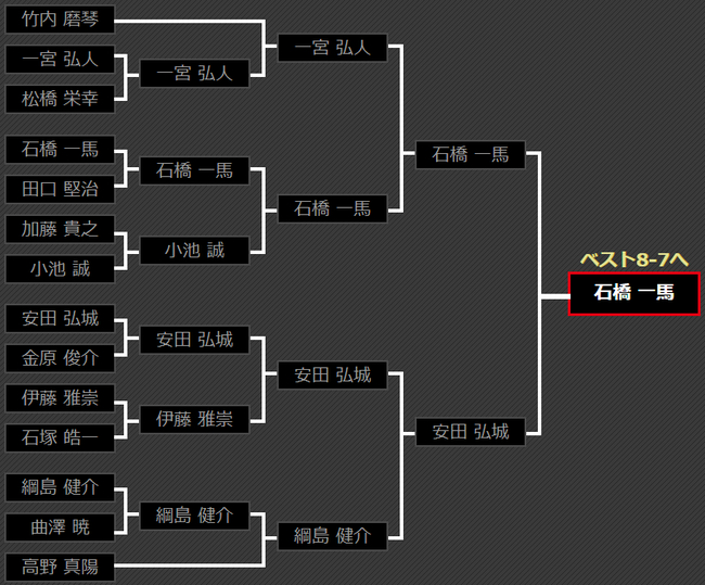 第7区东京本地选手石橋 一馬没有遇到特别强的阻力,杀入8强也在情理之中,至此,8强中东京地区选手杀入4人!东京系简直是全线暴走啊~