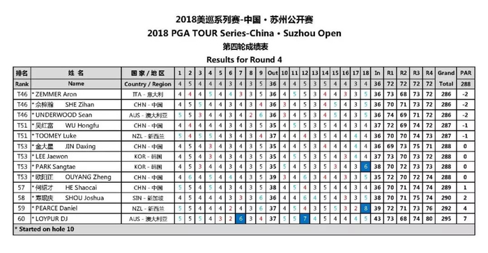 本周苏州公开赛总共144名球员参赛,中国内地球员为55位, 其中14人晋级。除了袁也淳外,肖博文、曹一、张蕙麟等人也有不错的表现,肖博文与曹一四轮均交出278杆(-10)的成绩单,排名并列第12位,张蕙麟则以279杆(-9)的成绩,排名并列第16位。