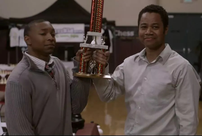 在掌声中与教练合影,尽管未能夺冠,也不失为另一种成功:成功证明自己也有能力在白人举办的比赛中崭露头角,放牛班的学生也有不输人的一面,单亲家庭的孩子也不会落于人后……大概这一座奖杯不再是一个人的荣誉,更是一个班、一群人的荣誉——在这黑白六十四格的天地里,原本被看低的人通过努力也得到了肯定,他们可以说是在棋盘上找到了一条道路,从过去走向有无限可能的未来,也愿更多人能找到这条路。