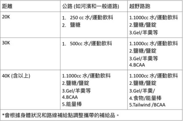 长距离的练习,我大致上的补给品有以下这些,根据路线和距离大概可以用下表表示。