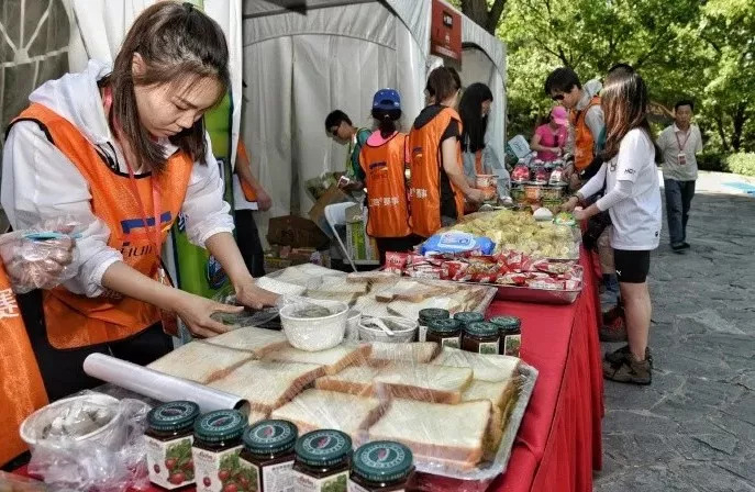 赛事方在常规补给的基础上融合了江浙特色小吃,足见其用心之处。比如麻糍、年糕干、手工米馒头、灰汁团、溪口千层饼、酱萝卜、臭冬瓜、奉化芋艿头,毛笋烤肉、黑饭......还有很多叫不上名字的食物。