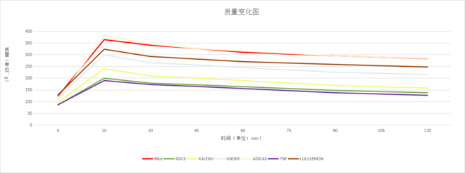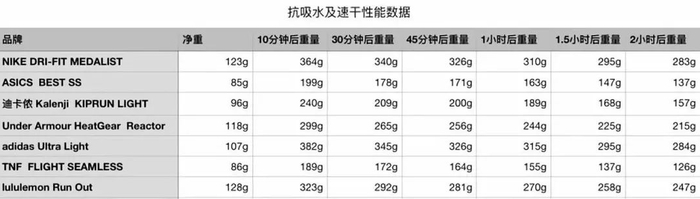 在完全无外力的自然环境中,每隔固定的时间秤取他们的重量,最后得到了这张快干实验的跑步运动T恤质量变化表。