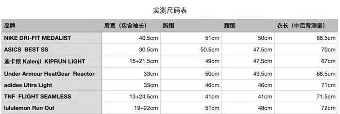 NIKE DRI-FIT MEDALIST、lululemon Run Out、Under Armour HeatGear Reactor的尺码则明显适合身材更为魁梧的欧洲男性,胸围与肩宽同样较宽,领口也十分宽松。