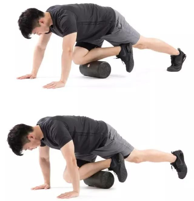 ①趴在地上或瑜伽垫上,双手支撑于地面,将泡沫轴放在一条大腿的下方,这条腿向后伸直并使脚悬空,在髋部和膝盖之间来回滚动泡沫轴。