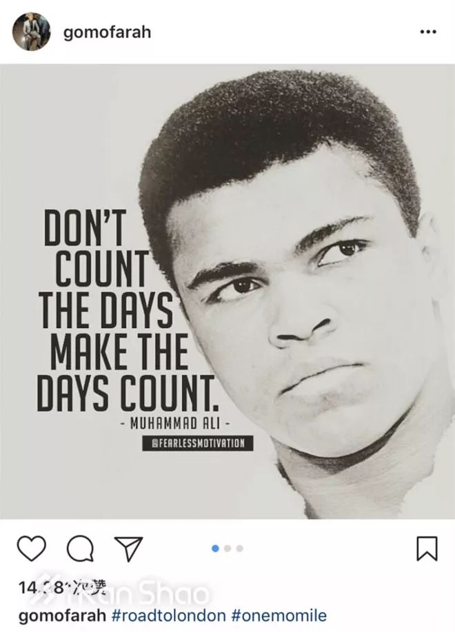 1秒,2秒,3秒……滴答滴答的声音在莫·法拉耳边走过,即将退役的紧张感让他一刻也不能停,偶有烦躁,他便用偶像阿里的名言提醒自己,’Don’t count the days,make the days count.’(不要掰着指头数日子,要让每一天都过得有意义)他总是想多做一点,因为那样会证明他可以做到。
