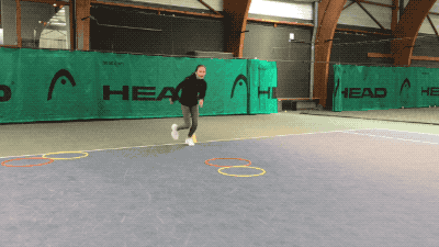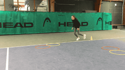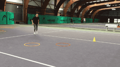 第一组练习,在小选手前方放置一锥桶,右侧放置两圆环,小选手从锥桶后方出发,上步经过两个圆环,后停住做挥拍击球动作,最后快速回到起点并重复动作4次。