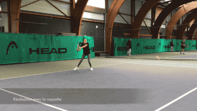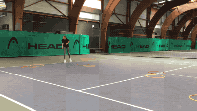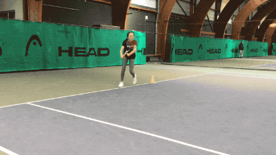 第四组练习,小选手在上一组练习的基础上,撤下指示物,进行标准的正手击球练习,注意使用到之前训练的步伐与技术要点。