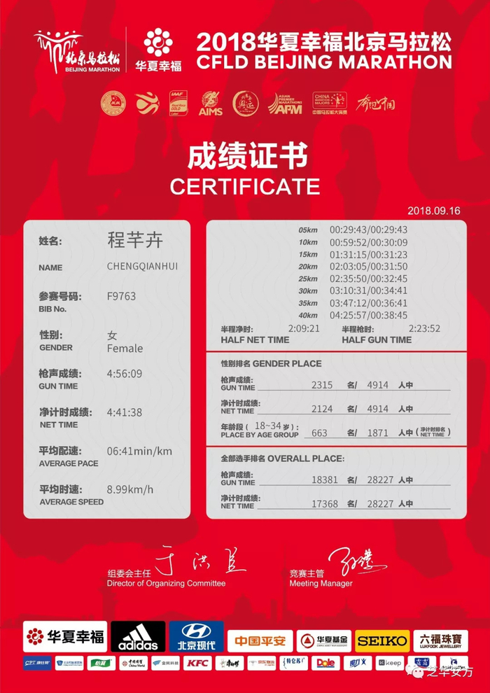 就这样,我看到了最后冲刺的800米,到达终点的那一刹那,我大喊了一声!是释放,更是一种解脱。开始大哭,觉得自己这42公里真的很艰难。立马掏出手机,给我最爱的人打了电话。我知道他一直在担心我。电话里,我只是边哭边对他说:“我好累,好疲惫,好不容易。"那时候的我,哭的像个泪人。他好像也不知道怎么表达:只有各种安慰和鼓励。这就足够了。纵使很爱哭,但我觉得自己也足够坚强。撑不下去的时候,我告诉自己,身体可以服从于意志。最终我以4小时41分,完成了我人生中第一个马拉松!但是,还是要友情提示大家,马拉松毕竟属于一项极限运动,一定要在自己身体承受范围内量力而行。
