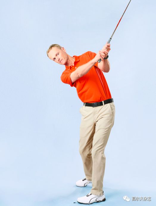 练习时颠倒双手握杆的好处是,能让两手在触球中更自然地围绕身体“拐弯”,然后斜向朝左肩移动——这是纯粹击打的关键。用四分之三的速度做几次空挥练习,你会立刻感受到。沿曲线向上拉动握把通过击打区,而不是沿与地面平行的直线。逐渐增加杆头速度打出更有力击球的同时你将获得稳定性。