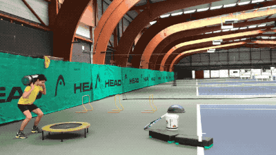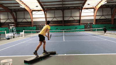 第四组练习,同第二组练习类似,小选手踩在平台上进行发球练习。发球起跳后前脚落于地面。