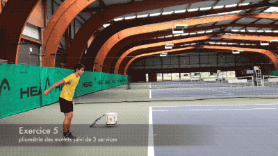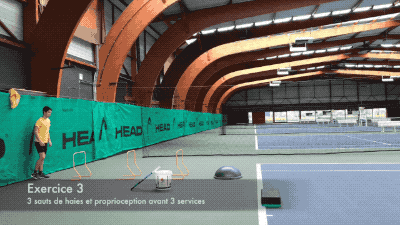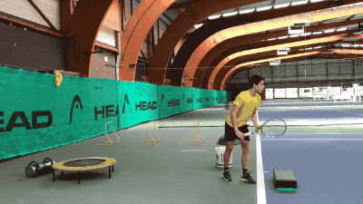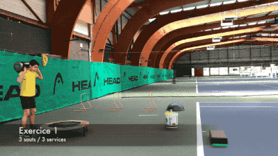 第二组练习,在结束第一组练习后,进行发球练习,前方放置一平台,注意并步发球跳起后,前脚向前落于平台上,保持身体稳定。