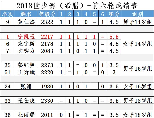 和往年一样,今年的世少赛为11轮瑞士制比赛。中国军团前六轮过后成绩如下: