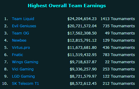 在一个名为“eSports Earnings”网站的数据库中,有一项以“获得的赛事奖金数目”为排行依据的电竞俱乐部排行榜,Liquid以上千场赛事、超两千万美元的赛事奖金排在榜单第一位。