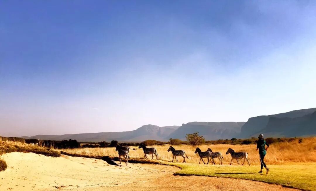 非洲人总来我们中国跑马拉松而毛莎却反其道而行,跑到了非洲。毛莎就在今年6月参加了以非洲五大兽命名的Big FIve马拉松,非洲著名的五大兽是指:非洲狮,非洲象,非洲豹犀牛,野牛。这场比赛是在南非Entabeni动物保护区内进行的,而你很有可能会和这些猛兽跑个“碰面”。而赛道也是虐到惨烈,需要翻过一座山,四公里四十五度1700米的爬升,也有像沙漠一样让足迹深陷的沙子路。在非洲狮出没的区域,有持枪的警卫保护。谈及当时的感受毛莎说:“比赛最后十几公里完全看不到任何人,几度以为迷路了,太阳渐渐西斜,丛林深处传来不知名动物的嗷叫。独自跑在广袤非洲大地,使尽洪荒之力,追上小伙伴,在关门时间前艰难完赛。后来真的不敢想象如果比赛过程中碰到狮子的场面。”