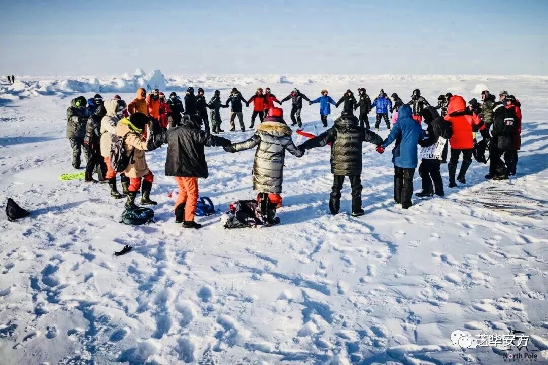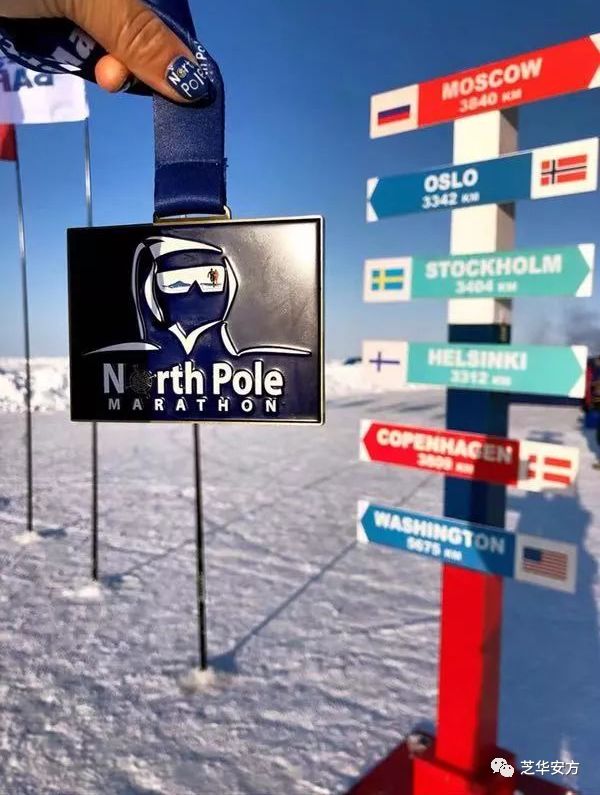 毛莎说尽管如此辛苦,也跑完了。当完赛后主办方用直升机把跑者们送到北纬九十度,跑者们围着九十度的旗帜,手拉手走一圈,”这就是一分钟内围着地球走一圈!对于刚刚结束艰苦卓绝的北极点马拉松的跑者们来说,没有比这更酷的仪式感了!”毛莎说。