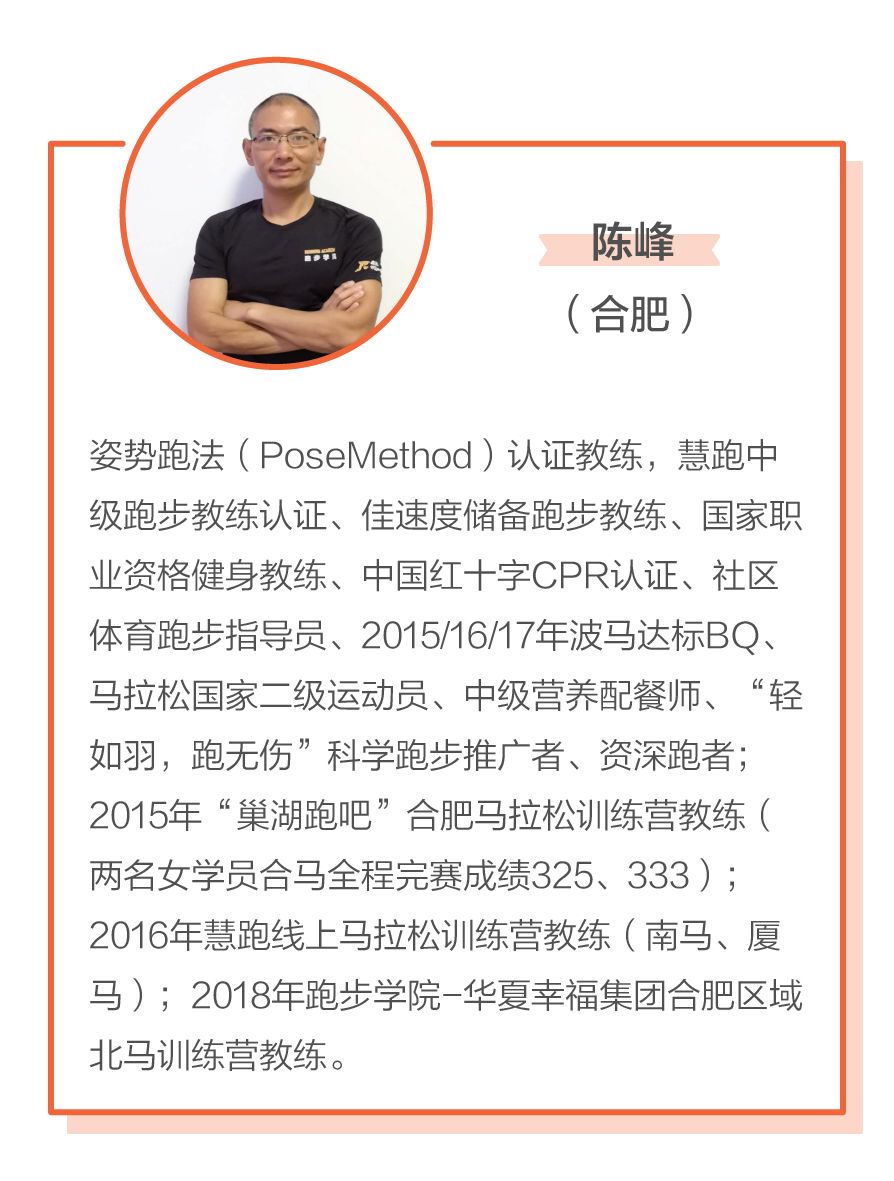 | 合肥 | 陈峰 | 姿势跑法level 1认证教练、姿势跑法合肥区教练 |
