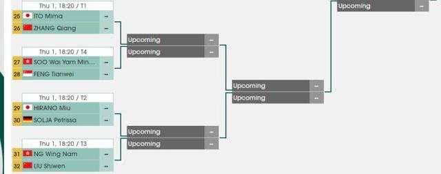 伊藤美城在4/4区的25号位,她在第一轮的对手是通过资格赛打上来的中国女将张蔷。平野美宇在4/4区的29号位,如果她能够在正赛第一轮获胜,就极有可能遇到4/4区第32号位刘诗雯。