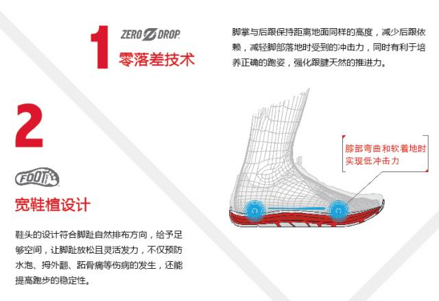 也就是脚掌和脚后跟零落差,这样的鞋子穿上跑步时,它才不会阻挡人自然的落地方式:从跖球部过渡到脚掌再到脚后跟。