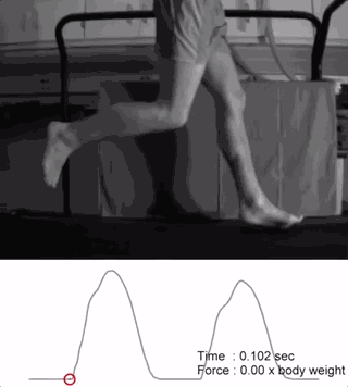 这是敬业的科学工作者在一个人赤脚跑时记录下了地面对脚掌的冲击力,并绘制了不同时间对应的冲击力图。
