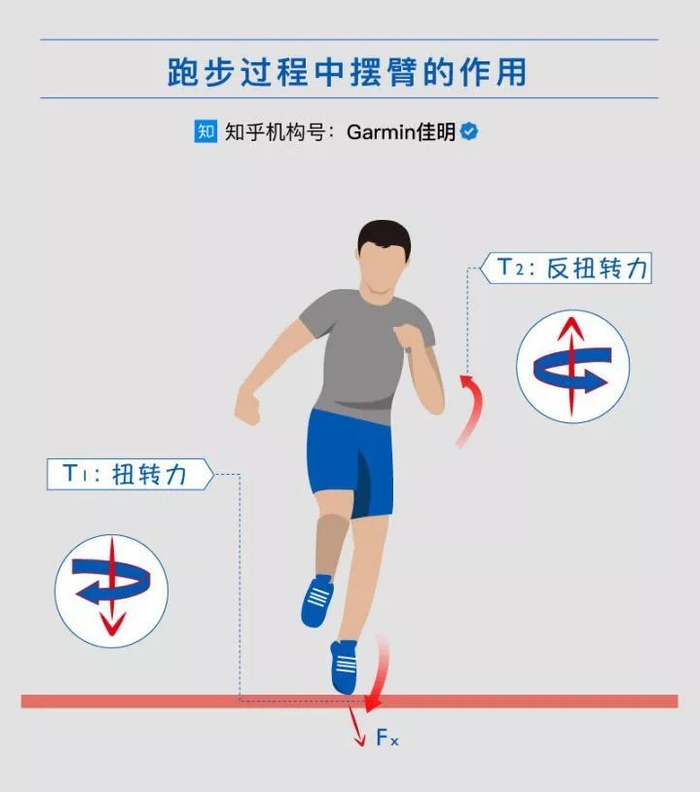 跑步的动作除了双脚不断的交替触地,还有上半身的摆臂——当左脚接触地面,地面产生的反作用力会将我们向前推进,这是我们上文提到跑步的动力来源。