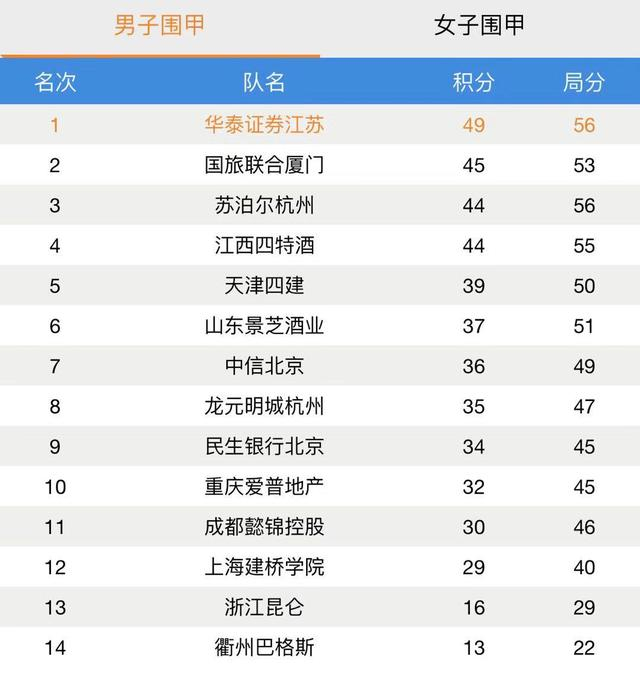 此前排名第四的厦门队本轮主场迎战龙元名城杭州,由于龙元杭州队的超级外援申真谞今年出场轮次已满13场,后面几轮已无法再出场(外援有上场轮次限制),厦门队没有让机会溜走:周睿羊在快棋战中击败夏晨琨,随后柯洁在主将战中击败丁浩,随着韩国李东勋拿下陈玉侬后,厦门队提前锁定胜局;最后邬光亚击败范胤但已无济于事。厦门队主场3:1击败龙元名城杭州队,积分榜上超越了江西四特酒和苏泊尔杭州,升至第二。