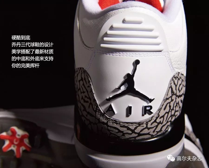 从这点出发,乔丹将经典篮球鞋设计跨界到高尔夫上,就不显得令人惊奇了。这是乔丹的风格,他希望自己在高尔夫也有一席之地。乔丹三代是耐克相继推出的第6款跨界球鞋,这款硬底球鞋的回归,保持了原有“大象皮肤”的纹路,以及标志性的“飞人扣篮”徽记。