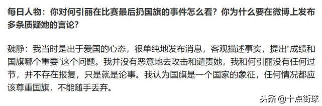 随后开始引发巨大争议,这让多次为国争光的何引丽感到惊慌失措,而魏静也在接受《每日人物》专访时表示,她与何引丽没有过节,只是就事论事,你可以不接国旗,一旦接了就不要扔掉,因为国旗就是一个国家的象征