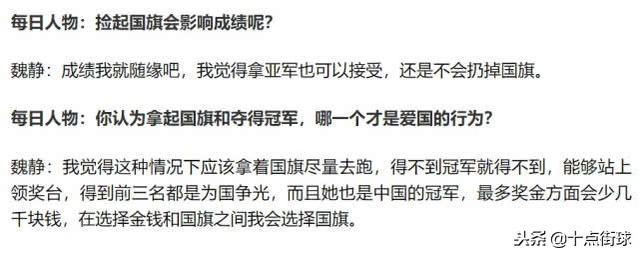甚至魏静还表示,国旗在自己心中胜过成绩,得不得冠军不重要,亚军也能接受,顶多奖金少拿点,但绝不会扔国旗,我会拿着国旗尽量跑,在金钱和国旗之间,我选择国旗!
