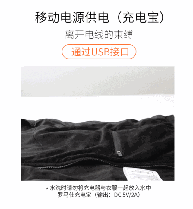 打开马甲内侧带插线口的口袋,接上移动电源后,马甲就能开启发热功能,享受安全又方便的温暖。