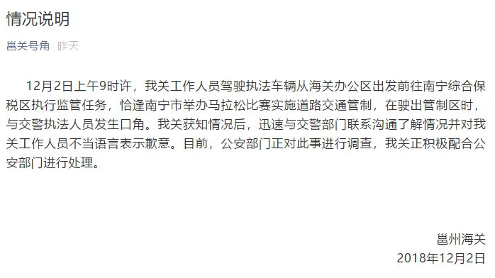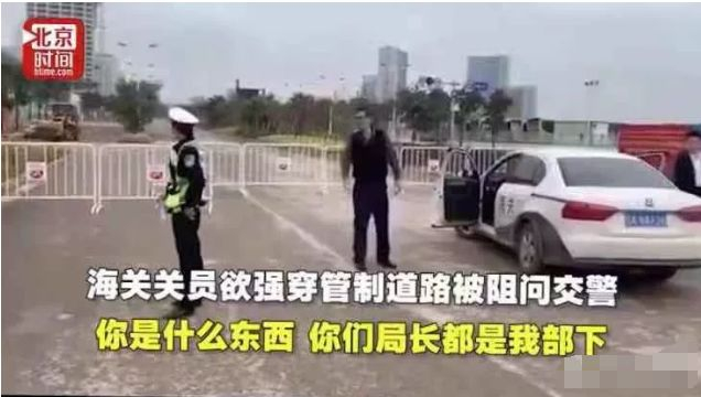 据了解该男子确系南宁海关工作人员,因不愿绕路而试图穿过管制路段被拦。事后邕州海关回应称:我关获知情况后,迅速与交警部门联系沟通了解情况并对我关工作人员不当语言表示歉意。