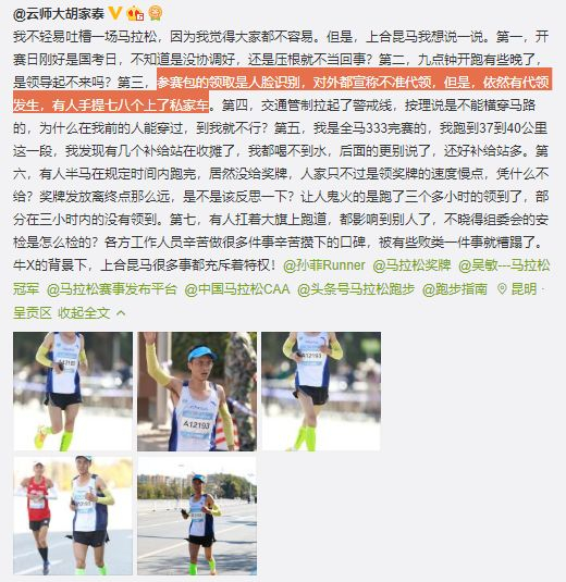 据了解,本届赛事采用“人脸身份识别系统”对参赛选手进行身份核验,杜绝替跑行为。但是赛后有选手吐槽赛事存在诸多问题:开赛晚、违规代领参赛包、半马有人领不到完赛奖牌、扛大旗上跑道影响比赛……