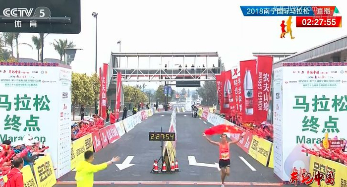 3. 南宁马拉松:程乾育获国内第一,披国旗冲过终点12月2日上午,第十三届南宁国际马拉松比赛开跑。经过两个多小时的比拼,男子组冠军由埃塞俄比亚选手获得,成绩为2:18:26,蒙古选手以2:23:39的成绩获得亚军,第三名是来自埃塞俄比亚的选手,成绩为2:25:05。