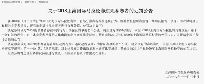 近日,上马组委会在官网公布了对两名违规选手的处罚公告,其中一人系替跑,一人系跨区起跑。