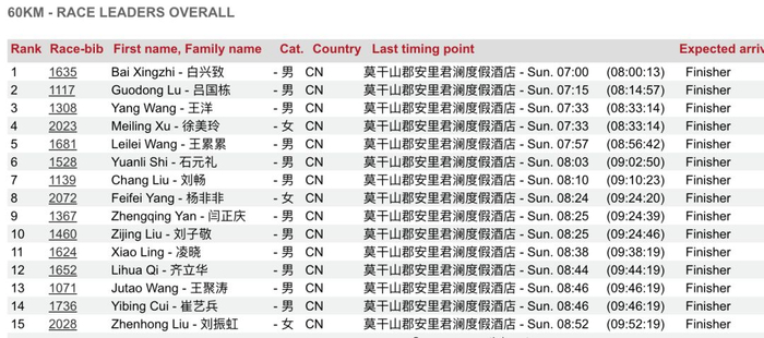 历经一夜鏖战,2日一大早,60公里项目男子冠军产生,1635号选手白兴致冲线,用时8小时13秒;亚军吕国栋用时8小时14分57秒;季军王洋与女子组冠军徐美玲同时冲线,用时8:33:14;杨非非以9:24:20的成绩获得女子组亚军;季军由刘振虹获得,用时9:52:19。而中国最能跑的“姥姥”55岁的邢如伶以9:54:26获得女子第四。