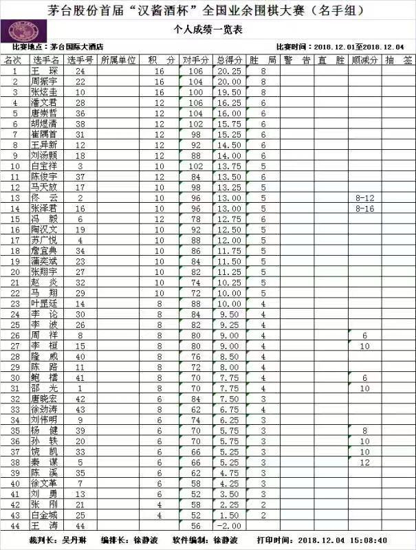 汉酱酒杯王琛夺冠,周振宇张炫圭分列2、3名