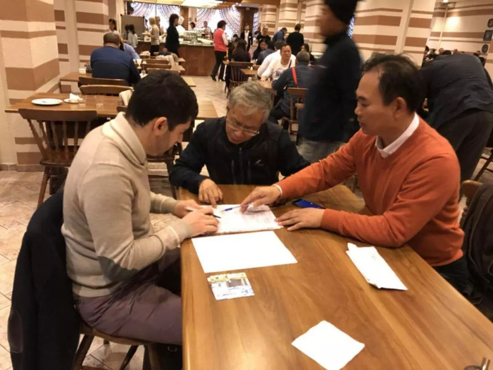 2016年底,我们就通过棋后诸宸和女子特级大师谷笑冰与特沃列茨基家人以及特级大师尤苏波夫联系,谈购买《未来冠军学校》丛书中文版权的事情。经过大半年的电文来往,2017年10月我们终于在莫斯科宇宙大酒店( OSMOS Hotel)签约。