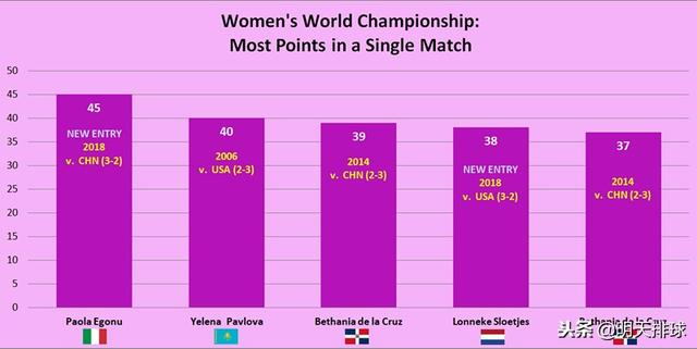 打破女排世锦赛历史个人单场得分纪录确实是年度黄金时刻。要知道,艾格努打破的是一项尘封12年的纪录。2006年世锦赛,哈萨克斯坦在一场五局大战中惜败美国,队中核心帕夫洛娃发挥出色,独得40分冠绝全场。
